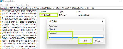 6、打开InprocServer32中的(Default)键并将其值设置为空白,然后单击“确定”。您可以看到“(未设置值)”的数据现在显示为空白。