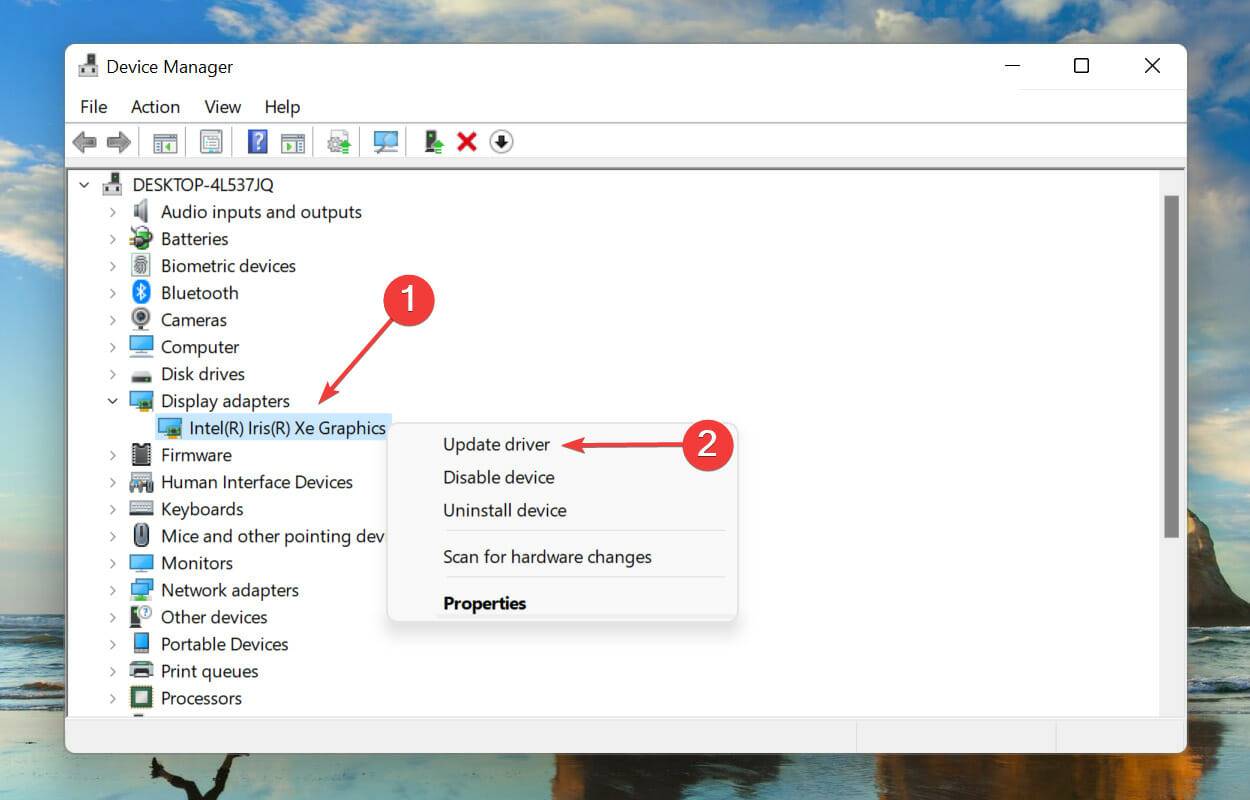 接下来,右键单击图形适配器并从上下文菜单中选择更新驱动程序。