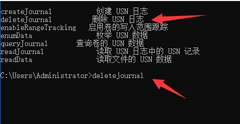 9、最后输入“deletejournal”回车删除usn日志即可。