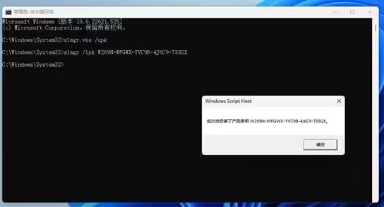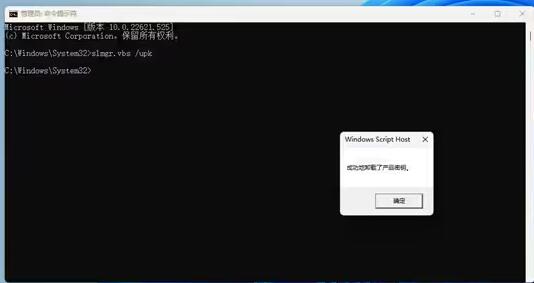 【slmgr.vbs /upk】复制以上命令,并在MSDOW窗口中右击以粘贴此命令,按回车进行确定。此时弹出窗口显未【已成功卸载了产品密钥】。