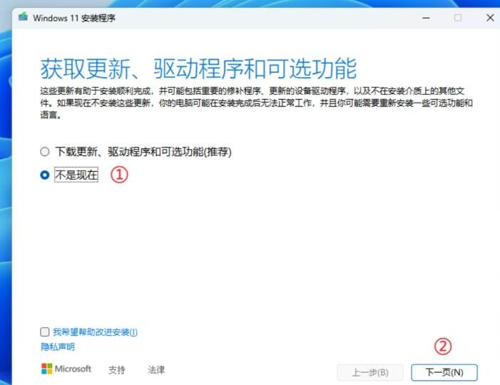 4、选择「不是现在」然后下一页。这里表示安装过程中,不更新也不下载驱动程序,否则浪费时间了。