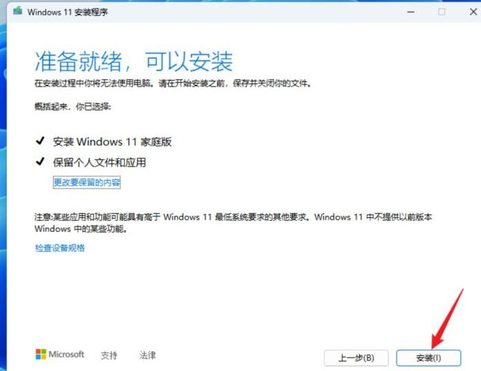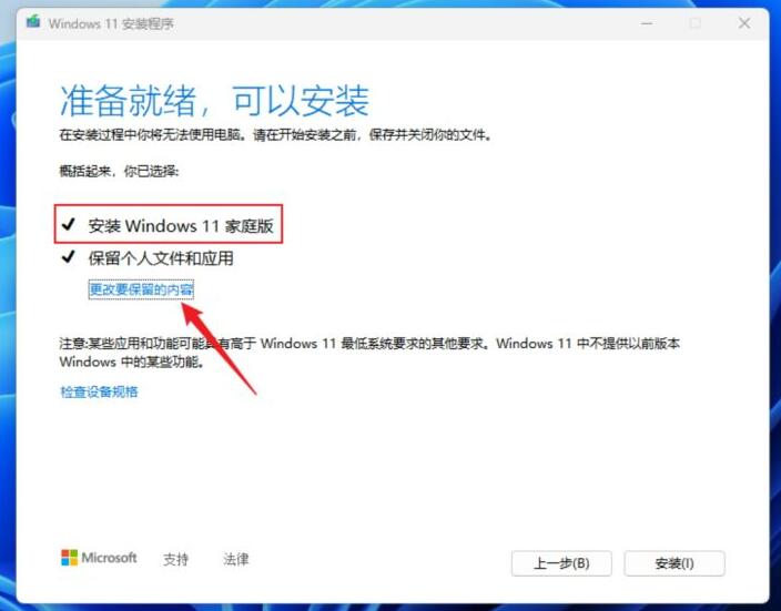7、确认下图中显示的是“安装Windows11家庭版”,然后点击「更改保留的内容」。
