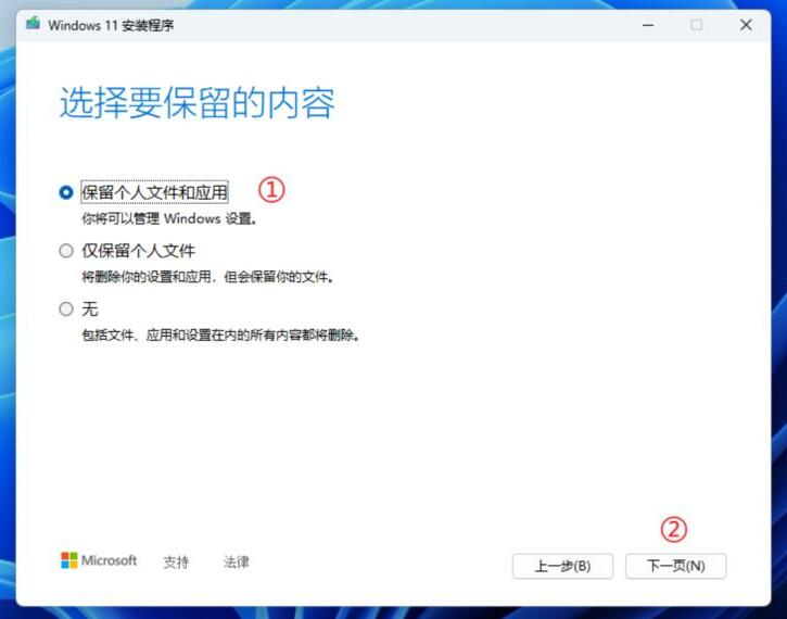 8、点击「保留个人文件和应用」。这样安装完成后,当前系统中所有安装好的软件,各种设置,各种文件等都不会丢失。