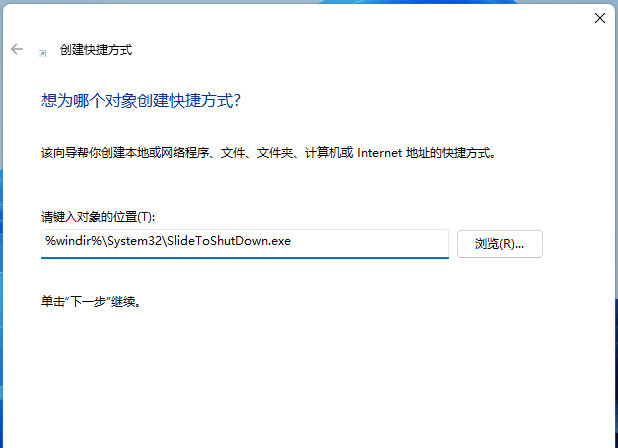 2、创建快捷方式窗口,请键入对象的位置,输入:%windir%\system32\slidetoshutdown.exe然后,单击“下一步”继续。