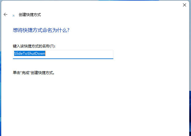3、键入该快捷方式的名称,不填写的情况下,默认slidetoshutdown,然后单击“完成”创建快捷方式。