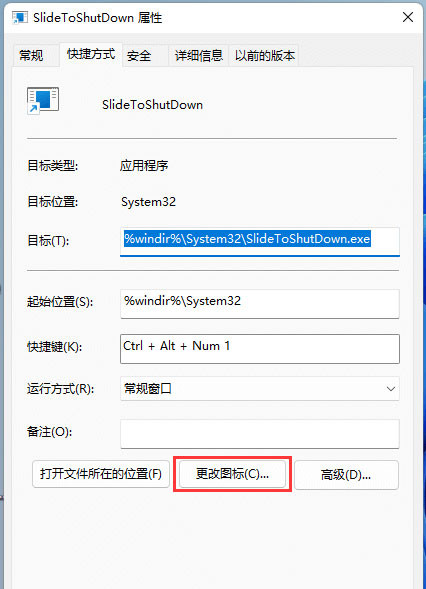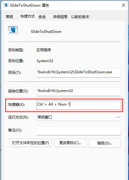 5、slidetoshutdown 属性窗口,切换到快捷方式,设置快捷键。