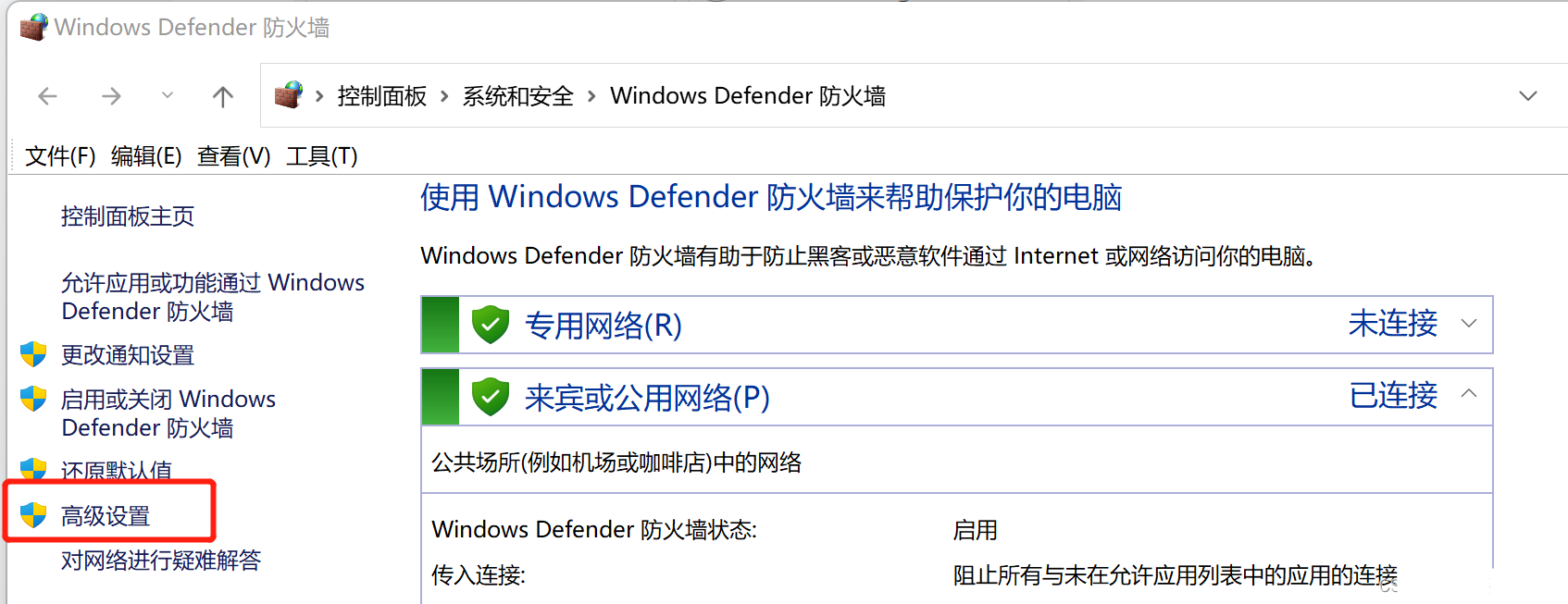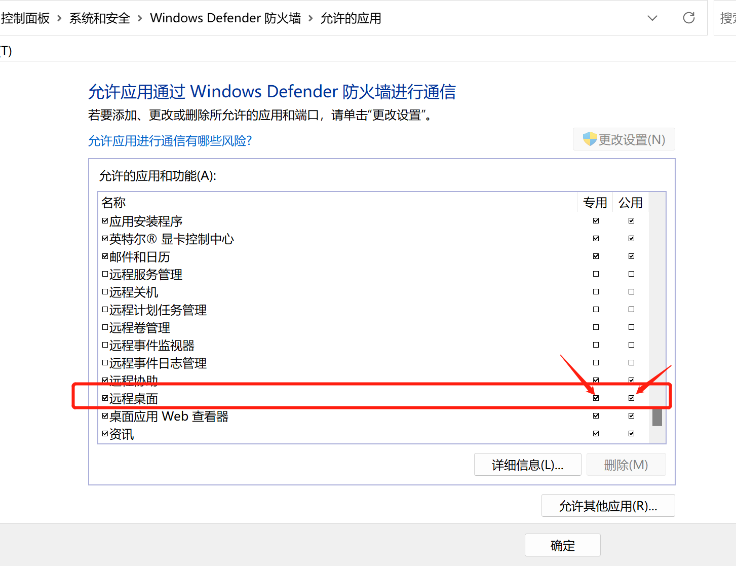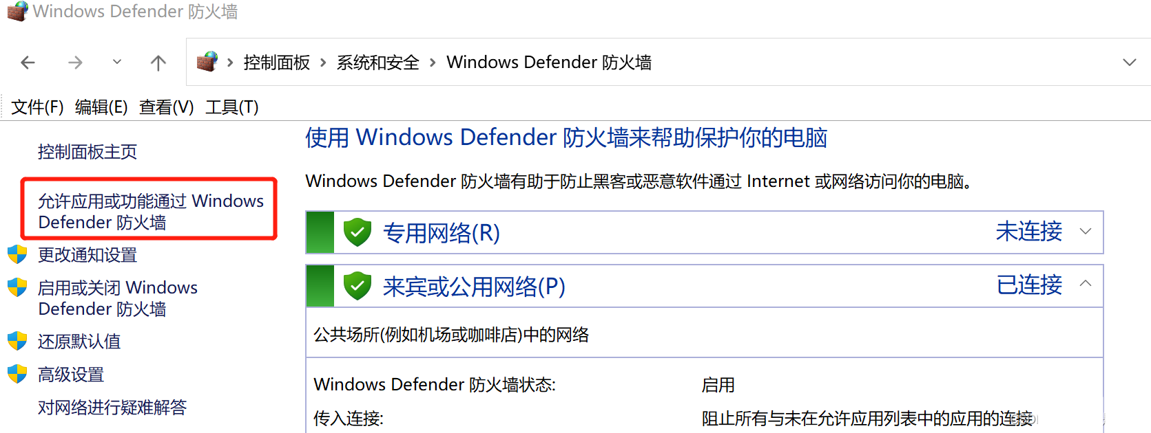 3.2 防火墙中点击 允许应用功能通过Windows Defender防火墙,将上面新建的规则在专用和公用网络上都打上勾,允许通过。
