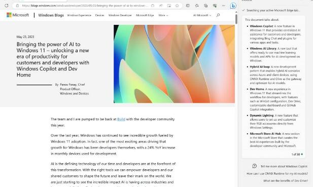 Windows Copilot 在前台与 Microsoft Edge 对接,并显示网站摘要。