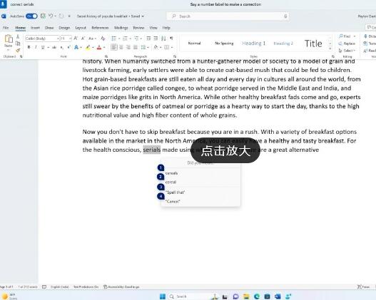 显示更正窗口的 Word 文档,其中包含文本“谷物”的候选内容。