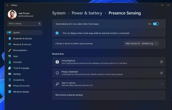 对于配备支持注意力检测的存在传感器的电脑,我们推出了自适应调光。可以在“设置”>“隐私和安全”>“存在感应” 下找到这些设置 。