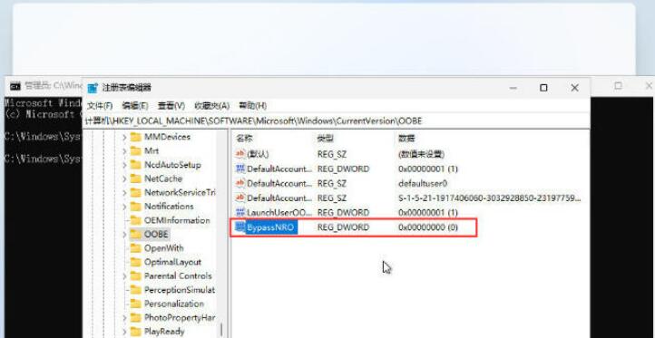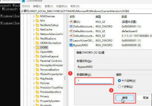 3、给这个新建的值命名为【BypassNRO】,双击打开BypassNRO这个值,然后在编辑 DWORD (32 位)值窗口,将数值数据修改为【1】,再点击【确定】。