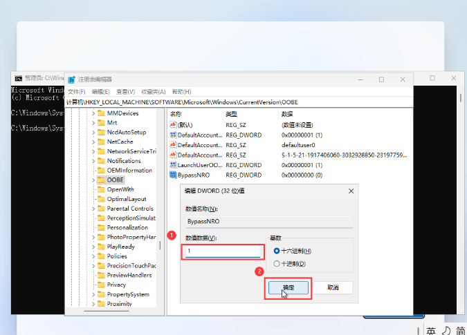 3,给这个新建的值命名为【BypassNRO】,双击打开BypassNRO这个值,然后在编辑 DWORD (32 位)值窗口,将数值数据修改为【1】,再点击【确定】;