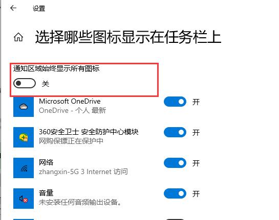 5、再接下来跳转到的界面中,将“通知区域始终显示所有图标”开关打开。