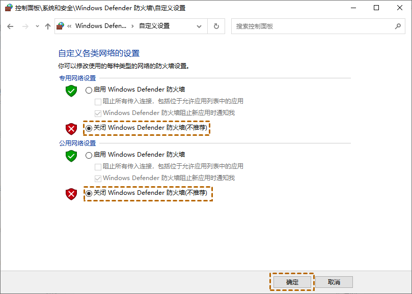 3、在“专用网络设置”和“公用网络设置”中选择“关闭Windows Defender防火墙”,并单击“确定”。