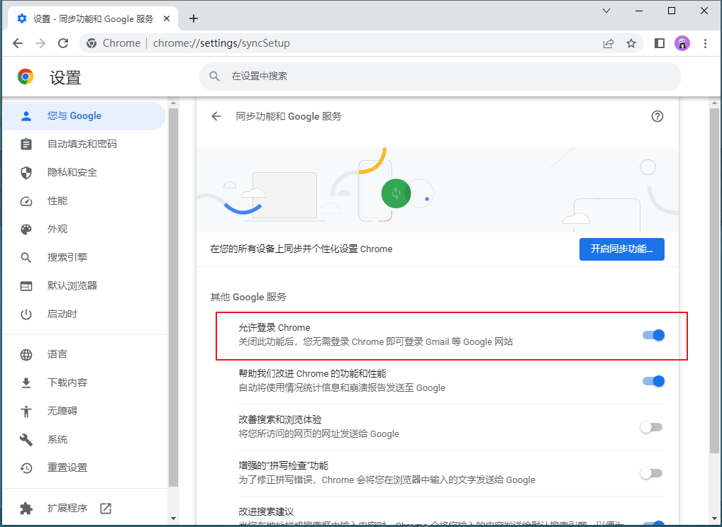 4、点击展开同步功能和Google服务,然后点击开启 允许登录chrome即可(如图所示)。