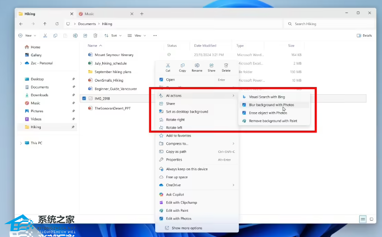 本次更新最大的亮点是在文件资源管理器中引入了“AI 操作”菜单。用户选中图片文件并右键单击时,会看到一个新增的“AI 操作”选项,其中整合了四项快捷功能: