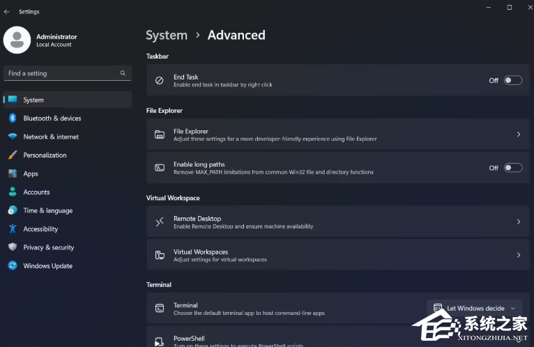 系统设置方面,原有的“面向开发者”页面被一个功能更全面的“高级设置”页面所取代。新页面不仅保留了将“结束任务”功能固定到任务栏等原有选项,还新增了多项实用功能,其中包括开启 MAX_PATH 支持,解决了“路径太长”的错误,允许文件资源管理器处理超过 260 个字符的长文件路径。