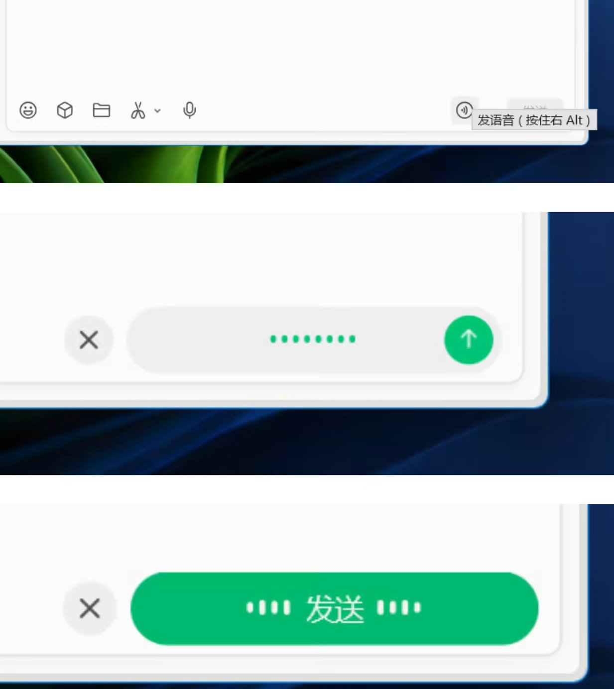 如图所示,微信 4.1.9 电脑版在聊天框的“发送”按钮旁边增加了一个语音按钮,用户也可以按住键盘的 Alt 键说话。