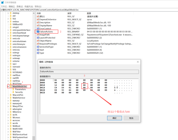 2、再找到“FailureActions”键,右键点击“修改”,修改该键的二进制数据,将“0010”、“0018”行的左起第5个数值由原来的“01”改为“00”,修改完成保存关闭;