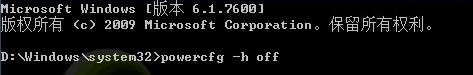2、在命令提示符中输入:powercfg -h off 按下回车键即可关闭休眠功能,若要重新开启的话则在命令提示符中输入:powercfg -h on 按下回车键即可重新开启。