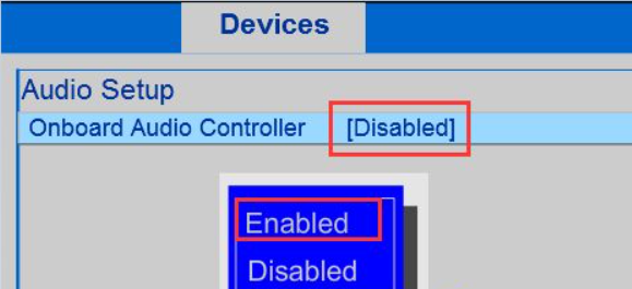 2、在【Audio Setup】上点击Enter按键,查看【Onboard Audio Controller】选项的状态,是否为【Disabled】,若是此状态,请在此选项敲击回车(Enter)按键,选择【Enabled】。