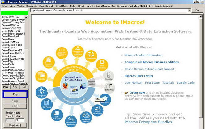 iMacros是一款基于浏览器的实用宏录制器,内置强大的组件和丰富的函数,主要用于录制网页。软件可以帮助用户建立动作宏,也可以让用户建立其它动作宏,例如:另存网页,储存网页上的组件,打印等等。使用iMacros,可以跨任何网站技术快速轻松地自动执行功能、性能和回归测试,非常方便。