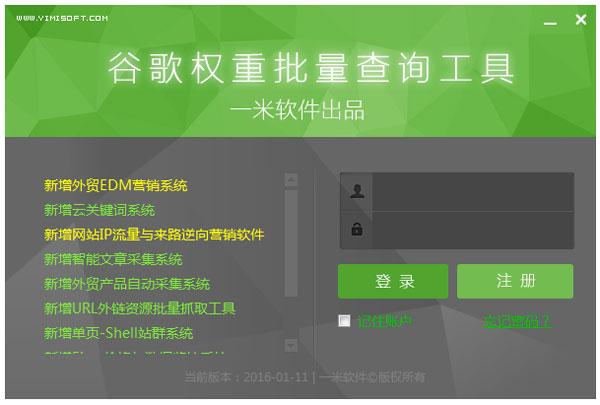 谷歌权重批量查询工具是一款非常不错的站长工具。本软件的操作非常简单,可以直接调用算法(根据国外着名的SEO网站moz的最新算法和巨量的蜘蛛爬取数据可以直接得出网站主域及页面在谷歌中的真实权重)api接口进行批量检测,改变了以往以PR值为主流的网站权重检测方式。