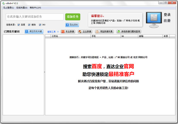 诚达企业信息采集软件是一款通过互联网在百度、搜狗、360找到最精准企业信息的信息查询软件。使用诚达企业信息采集软件,通过在百度、搜狗、360收录的1000多个大型的行业以及企业黄页,帮大家快速搜索最新、最全的优质客户。搜索到的信息,包括公司名、网站、电话、手机、邮箱等众多联系方式,该软件是销售人员找客户的必备工具。