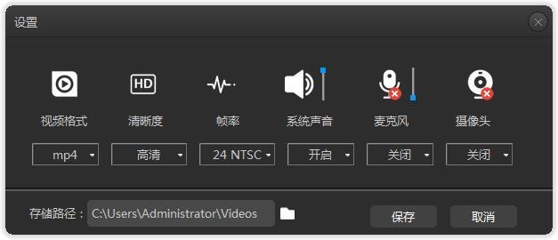 步骤三:在软件主界面右边点击齿轮设置按钮,进入视频参数设置界面,这个界面中,我们可以对视频格式、清晰度、帧率、系统声音及麦克风开关、摄像头开关等录制视频的基本参数进行设置和选择。设置好后,检查一遍点击保存按钮保存好设置。