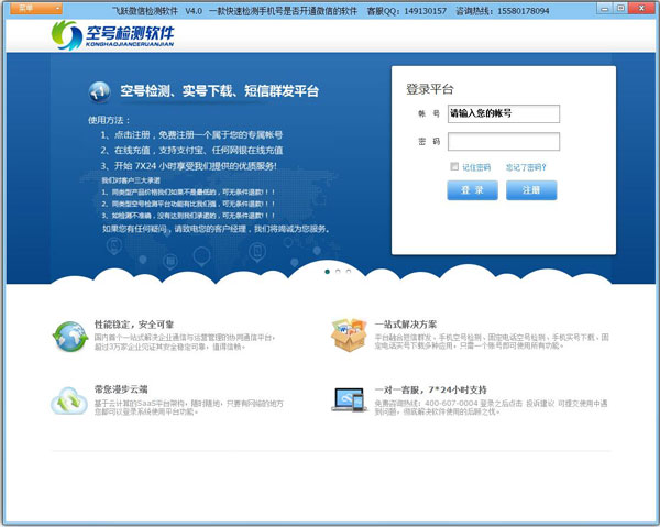 飞跃微信检测工具是一款非常多人喜欢的快速批量检测手机号是否开通微信工具,就是不需要你一个个去检查,就能够非常快的检测出手机号是否注册了微信的情况,欢迎大家下载使用。
