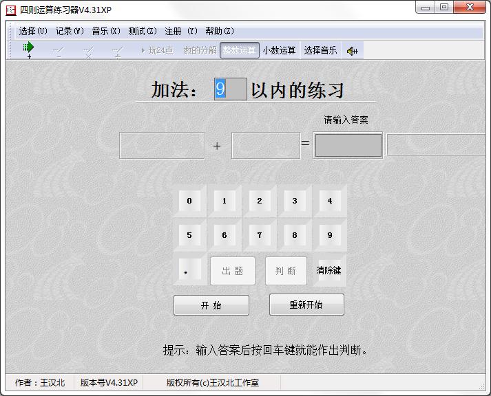 2、单击“开始”按钮再单击“出题”按钮,程序自动出题。在编辑区内输入答案,用鼠标单击“判断”按钮就可判断对错。程序会给出语音提示(答错时有正确答案提示)。