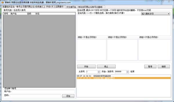 营销牛网易论坛签名修改器是一款绿色免费的用于批量进行网易论坛设置签名的软件。网易论坛需要1级帐号才能设置签名,本软件轻松帮您完成网易论坛批量改签名操作。