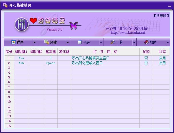 开心热键精灵是一款非常强大的高效率电脑操作软件,通过设置电脑各种热键,可以快速对电脑进行操作,有了这款软件,您在键盘上随手按几个键就能瞬间运行一个程序、或者打开一个文档、浏览一个网页,比如按Ctrl+B打开百度、按Alt+Q打开QQ,再也不用从一层层的开始菜单或者乱七八糟的桌面上去找那并不快捷的“快捷方式”了,就是这么神奇!