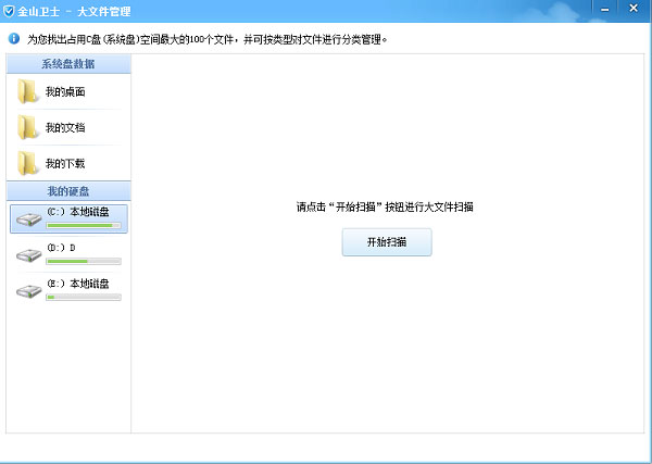 如果电脑的系统盘(一般为c盘)空间不足时,我们的电脑会变得运行缓慢,同时还会有某些软件会因为系统盘空间不足而无法安装等等一系列问题。这个时候应该怎么办呢?重装系统,文件备份、重装软件都不是三五分钟就能搞定的;于是,金山卫士大文件管理功能也就闪亮登场了!