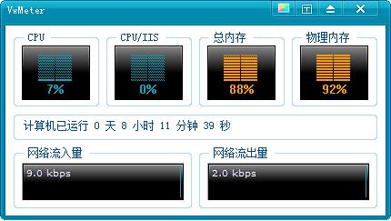 VwMeter(微盾仪表)是一款实用专业的“网络流量统计”软件,目前支持总 CPU 使用、IIS 使用 CPU、总内存、物理内存、计算机运行时间、网络流入和流出量监视,同时可以用最小化的方式完成对软件的运行,还支持对CPU的使用情况进行快速的监视。