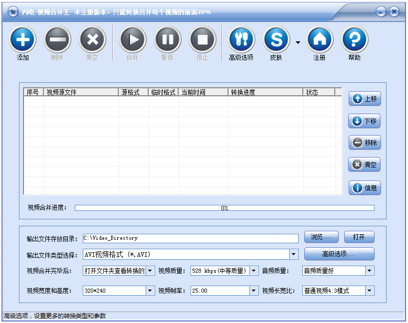 闪电视频合并王采用了最先进的编码和解码技术,转换合并的速度和质量极佳。还可以随意设置合并生产的视频音频文件的大小质量。(可以修改视频编码器、音频编码器、分辨率、比特率、帧率、采样率、声道等)。支持合并转换后自动关机功能。并且软件界面美观(可以更换软件皮肤),操作极为简单。
