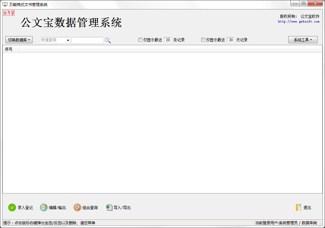 万能格式文书管理系统是款非常优秀且相当专业的万能收文管理工具,用途十分强大,主要适用于各种执法文书、法律文书、公文函件、合同协议、证明文书、常规文档、报表单据、客户管理等等,主要有采用开源的SQLite数据库,超强稳定。