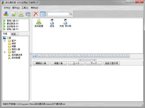 成功通讯录是一款非常受欢迎的通讯录管理软件,它可以帮你轻松管理各种商业或者家庭通讯录,它支持表格,图片,表情等插入,有效的帮你增长人脉关系,软件界面简洁,功能强大,拥有文件,操作,工具,帮助等功能操作,使用起来简单便捷,可以满足大家的日常所需。