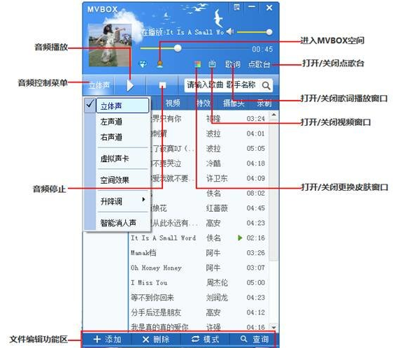 mvbox现已更新至v7.1.0.4,这次更新添加了直播音效、气氛和动画文字广播功能,此外支持大视频高清输出,屏幕捕获大视频,界面全新设计,多款精美皮肤,歌手歌词写真;海量立体声双音轨伴奏;高清录制视频美容;海量高清歌曲mv,视频免下载即播即看;家庭ktv个性化双屏显示!无广告,任何用户登陆即为vip蓝钻,让您免费畅享vip蓝钻功能。mvbox虚拟视频播放器是一款功能强大的多媒体卡拉ok娱乐软件,集在线录歌,在线k歌,虚拟视频等众多功能于一身,是国内最受欢迎的卡拉ok播放器和虚拟视频软件。