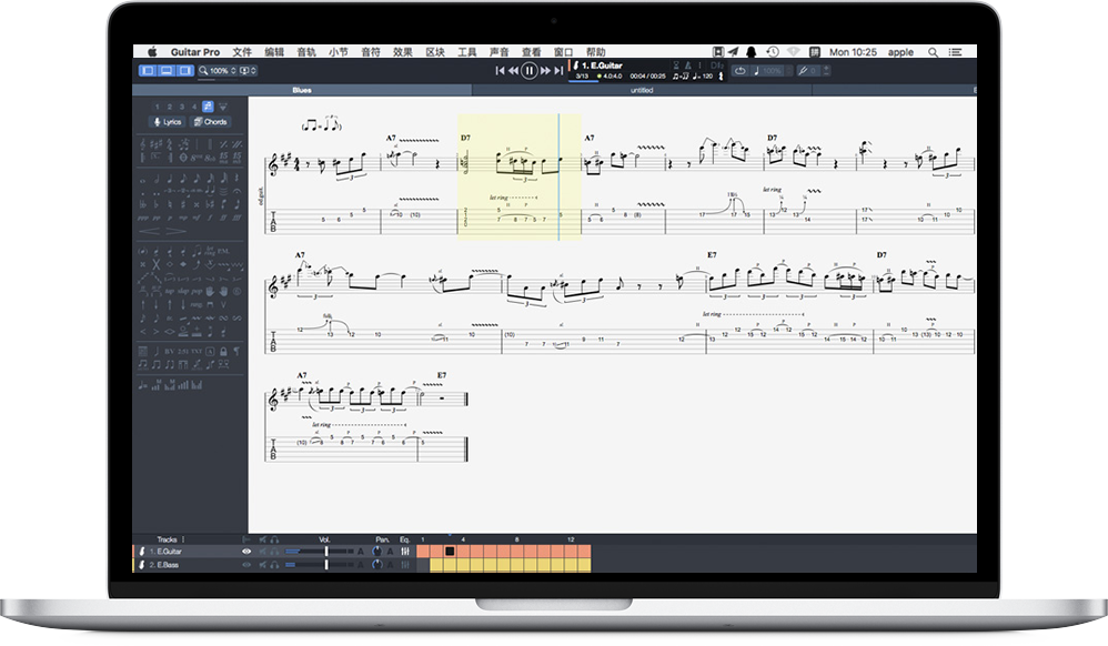3、Guitar Pro 7 兼容高分辨率屏幕(Retina 和 HD)和触摸屏。