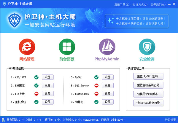 护卫神主机大师是一款安全防护高性能的服务器软件。使用该软件,可以帮助用户检测网站运行环境,并提供了一键安装功能。软件适用于ASP、PHP、MySQL、SQL等环境。