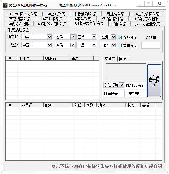 海盗QQ邮箱采集器可以采集来的QQ号或邮箱地址可供给营销朋友推广使用,海盗QQ邮箱采集器可以根据昵称、年龄、性别、地区等多种方式采集QQ号!