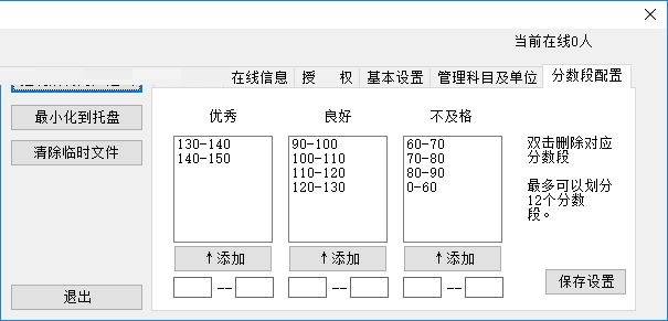 6、可以设置分数段配置,例如设置140-150为优秀、设置10-120是良好、90以下不及格,双击删除对应分数段最多可以划分12个分数段。
