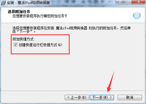 6、选择桌面快捷方式和创建快速运行栏快捷方式等附加任务