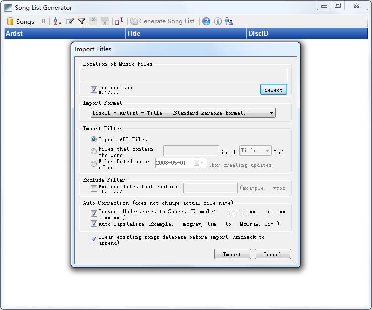 排除过滤器:此选项可让您排除某些曲目不包含在您的歌曲书中。此选项通常用于排除带有人声的曲目。一般标准是在标题或艺术家的某处有“wvocal”这个词,顺便说一句,这是程序搜索要排除的文本的地方。不会搜索DiscID。该选项可以与其上方的任何导入“包含”过滤器结合使用。
