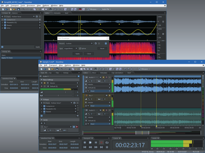 通过放大、淡入、淡出、增益包络、正常化、反转、反转、时间拉伸和音高移位工具来处理音频。