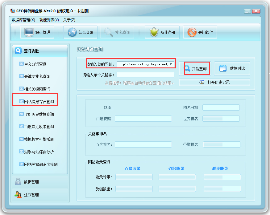 1、打开综合查询界面,选择您的网站,点查询。程序会自动保存您每天的查询结果。