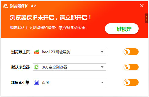 浏览器保护是一款主页防护工具,为您提供浏览器主页锁定、默认浏览器设置、IE搜索引擎锁定功能,让您浏览器不再被各类流氓软件篡改。一键锁定,上网轻松更安全!