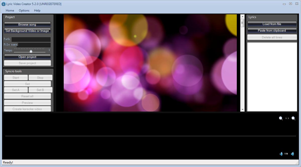该界面类似于经典的多媒体播放器,但具有创建选项。乍一看,您会看到预览屏幕,其中加载了所有视频或图像。说到卡拉OK,最右侧是“歌词”网格,您可以在其中加载文本文件并将其与视频重叠。避免在左侧选择背景效果,并允许您测试和观察项目的音频和视频功能。屏幕底部的波形支持音频。