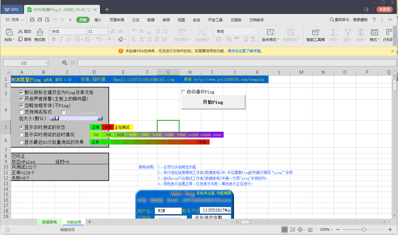 WSM批量Ping是一款运行在Excel中的网络监控软件,通过该款软件,用户能够对网络连通情况进行批量检测、监测等,具有录入信息方便、无须转换、批量检查速度快、检测结果显示直观、操作简单、使用方便等特色。